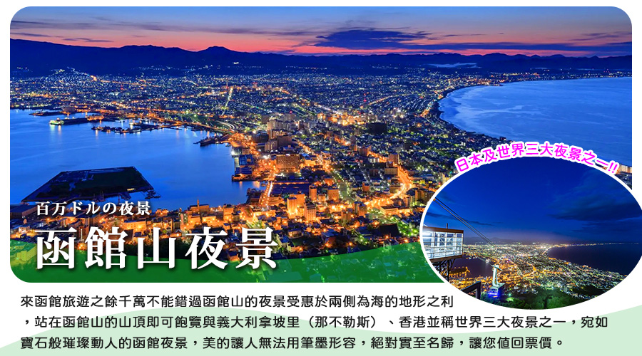 【函館山夜景】來函館旅遊之餘千萬不能錯過函館山的夜景受惠於兩側為海的地形之利,站在函館山的山頂即可飽覽與義大利拿坡里(那不勒斯)、香港並稱世界三大夜景之一,宛如寶石般璀璨動人的函館夜景,美的讓人無法用筆墨形容,絕對實至名歸,讓您值回票價。