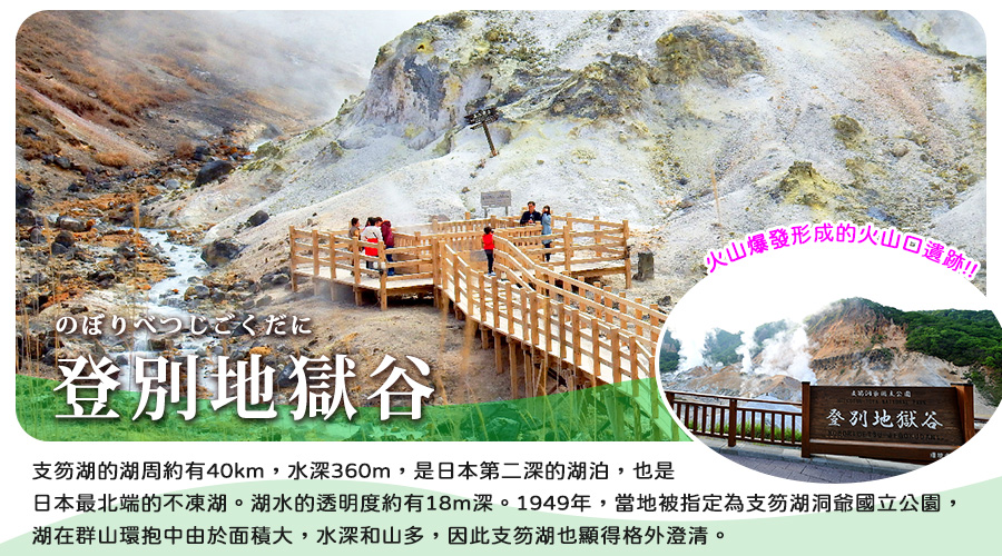 【登別地獄谷】位於登別溫泉街的東北側,是約1萬年前發生的笠山爆發所形成的噴火口,溫泉的出水量每分鐘高達3000立方公升,為登別最大的泉源,依地點不同,湧出之源泉水質亦不相同,可達11種之多。