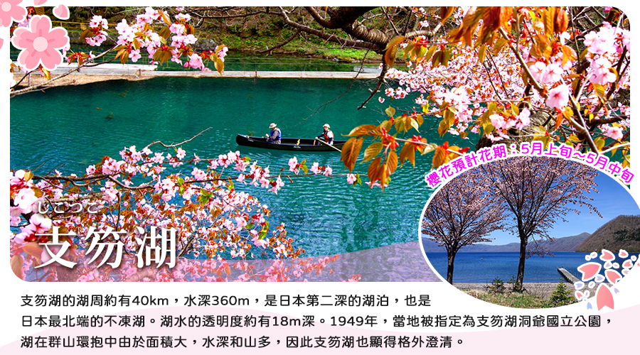 【支笏湖】支笏湖的湖周約有40km,水深360m,是日本第二深的湖泊,也是日本最北端的不凍湖。湖水的透明度約有18m深。1949年,當地被指定為支笏湖洞爺國立公園,湖在群山環抱中由於面積大,水深和山多,因此支笏湖也顯得格外澄清。