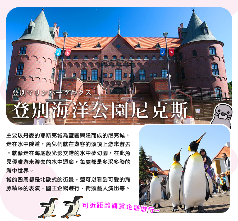 【登別海洋公園尼克斯】主要以丹麥的耶斯克城為藍圖興建而成的尼克城,走在水中隧道,魚兒們就在遊客的頭頂上游來游去,就像走在海底般光影交錯的水中夢幻園,在此魚兒優雅游來游去的水中迴廊,每處都是多采多姿的海中世界。城的四周都是北歐式的街景,還可以看到可愛的海豚精采的表演、國王企鵝遊行、街頭藝人演出等。