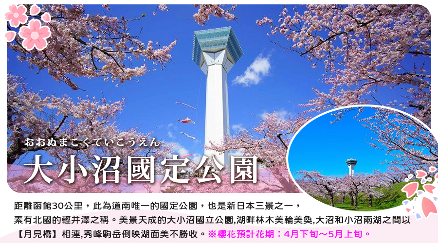 【大小沼國定公園】距離函館30公里,此為道南唯一的國定公園,也是新日本三景之一,素有北國的輕井澤之稱。美景天成的大小沼國立公園,湖畔林木美輪美奐,大沼和小沼兩湖之間以【月見橋】相連,秀峰駒岳倒映湖面美不勝收。