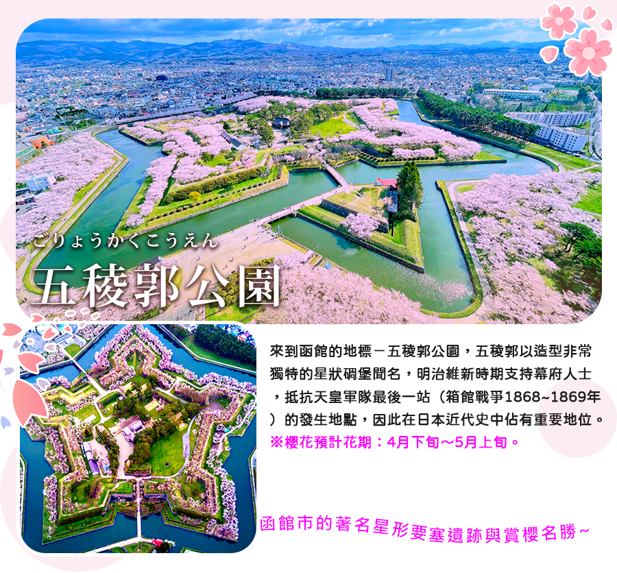 【五稜郭公園】來到函館的地標-五稜郭公園,五稜郭以造型非常獨特的星狀碉堡聞名,明治維新時期支持幕府人士,抵抗天皇軍隊最後一站(箱館戰爭1868~1869年)的發生地點,因此在日本近代史中佔有重要地位。