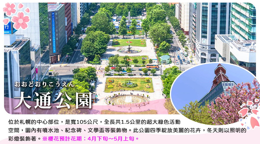 【大通公園】位於札幌的中心部位,是寬105公尺,全長共1.5公里的超大綠色活動空間,園內有噴水池、紀念碑、文學盃等裝飾物。此公園四季綻放美麗的花卉,冬天則以照明的彩燈裝飾著。